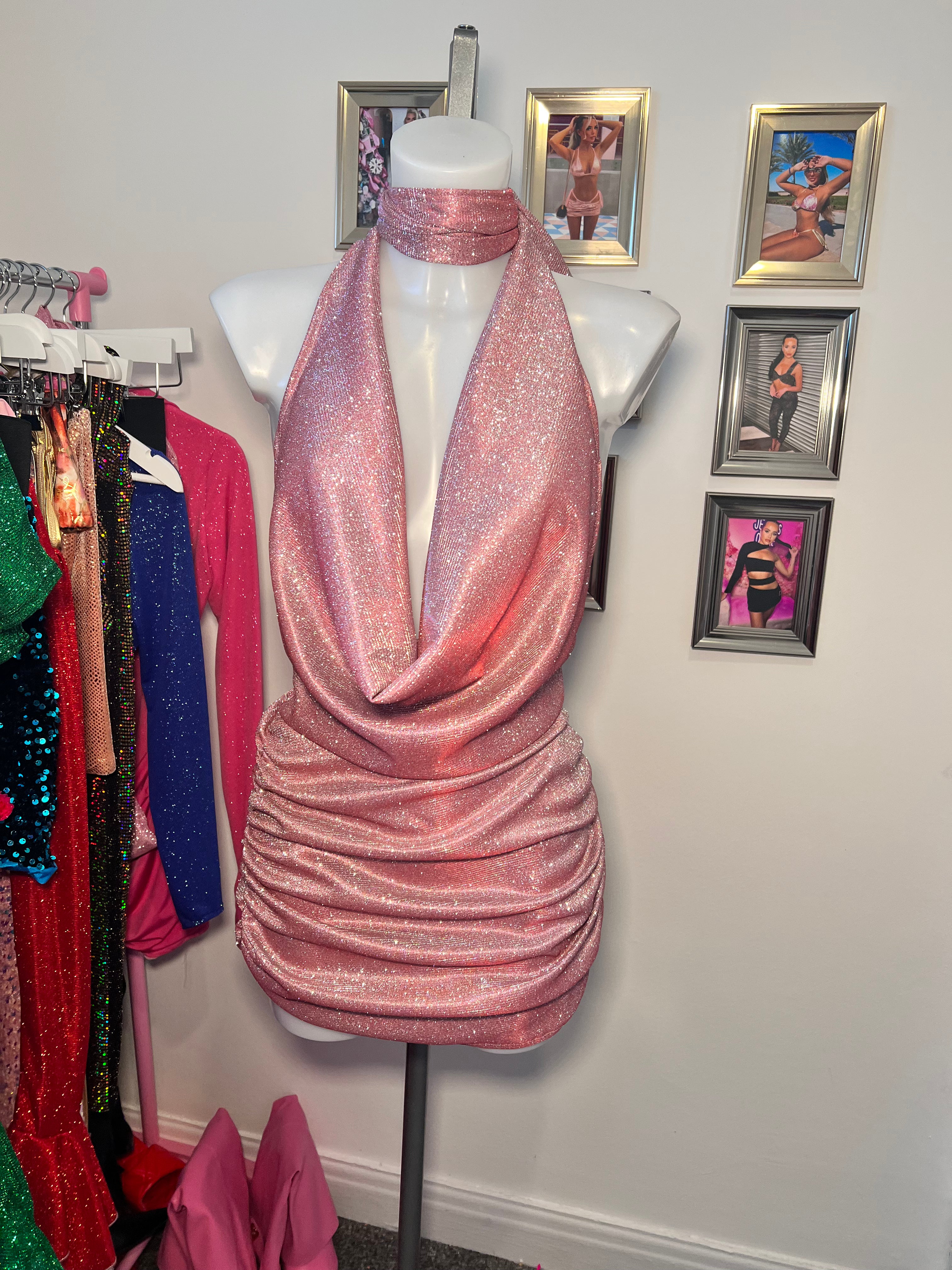 Dusky Pink Glitter Cowl Neck Ruched Dress / Made to order
