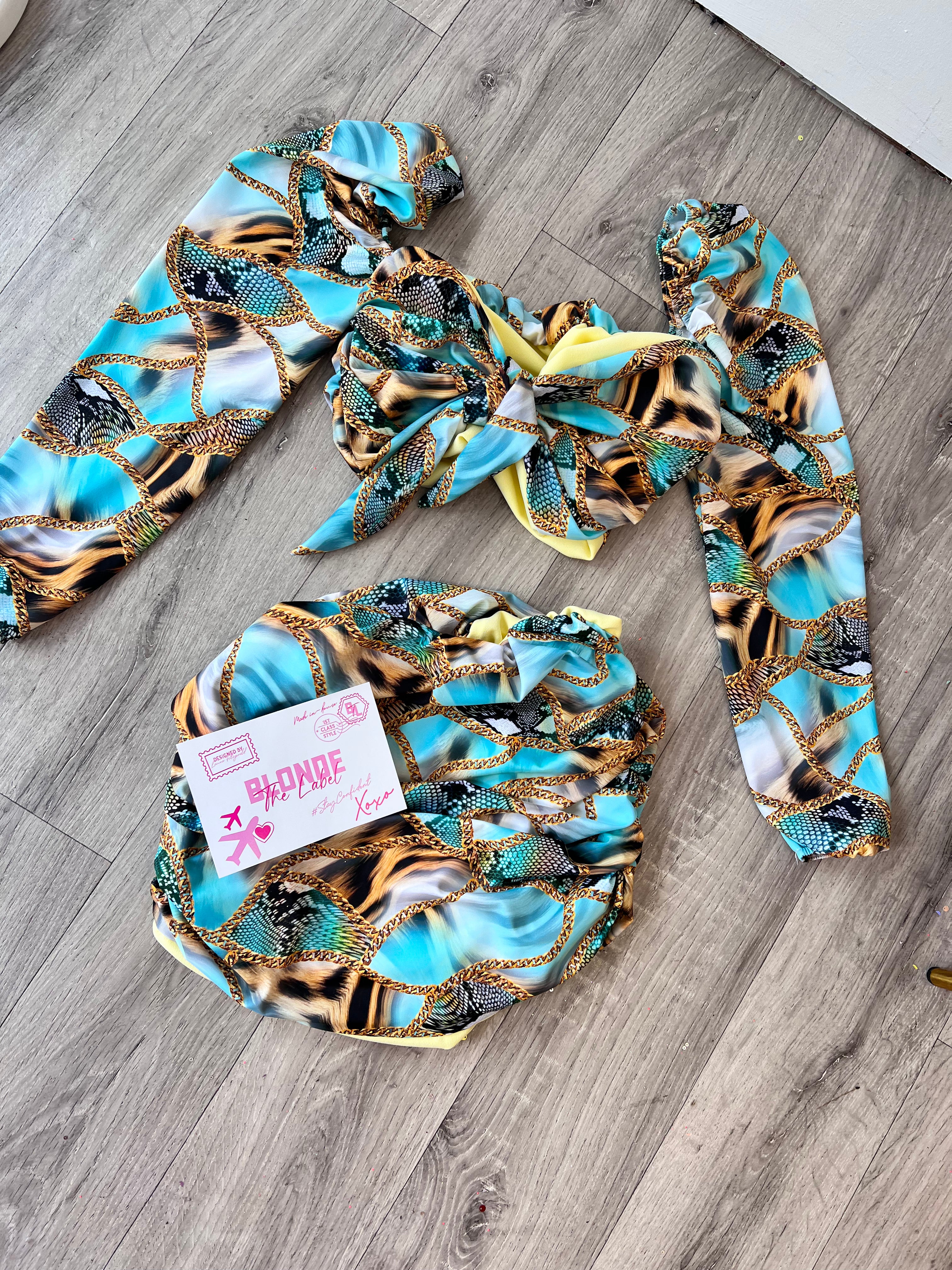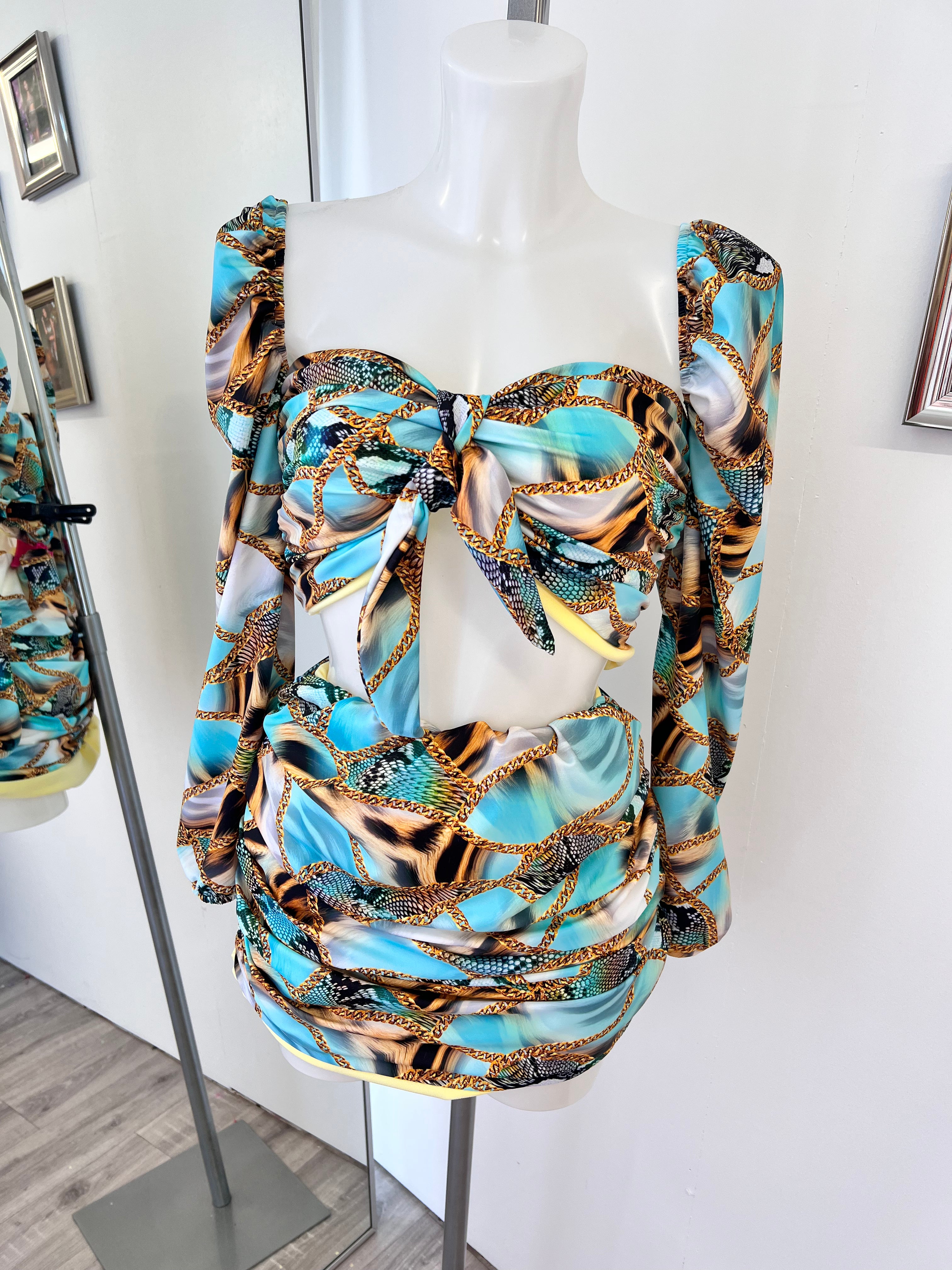 Aqua blue animal printed stretch fabric with gold foil chain print. Ruched skirt and top. Turnaround approx 2 weeks.