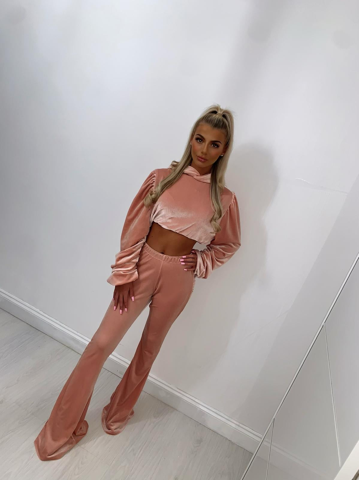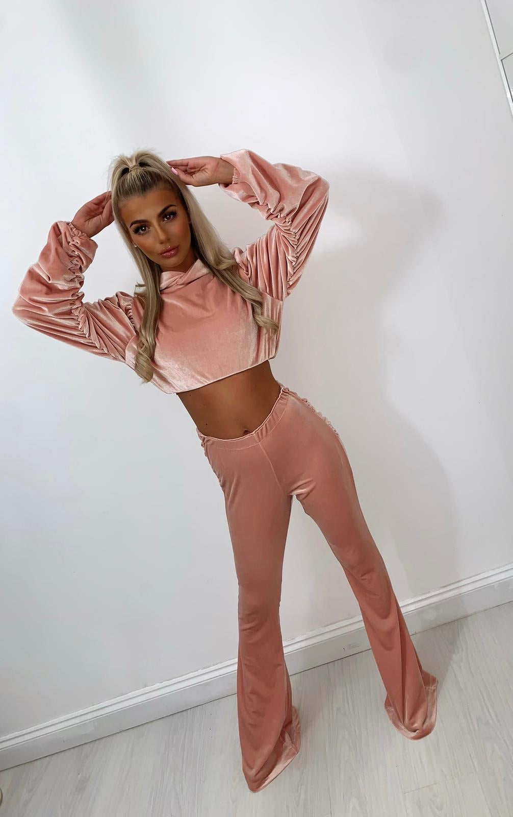 Blush Velvet in high waisted flares and hoody top with ruched bum and arms.