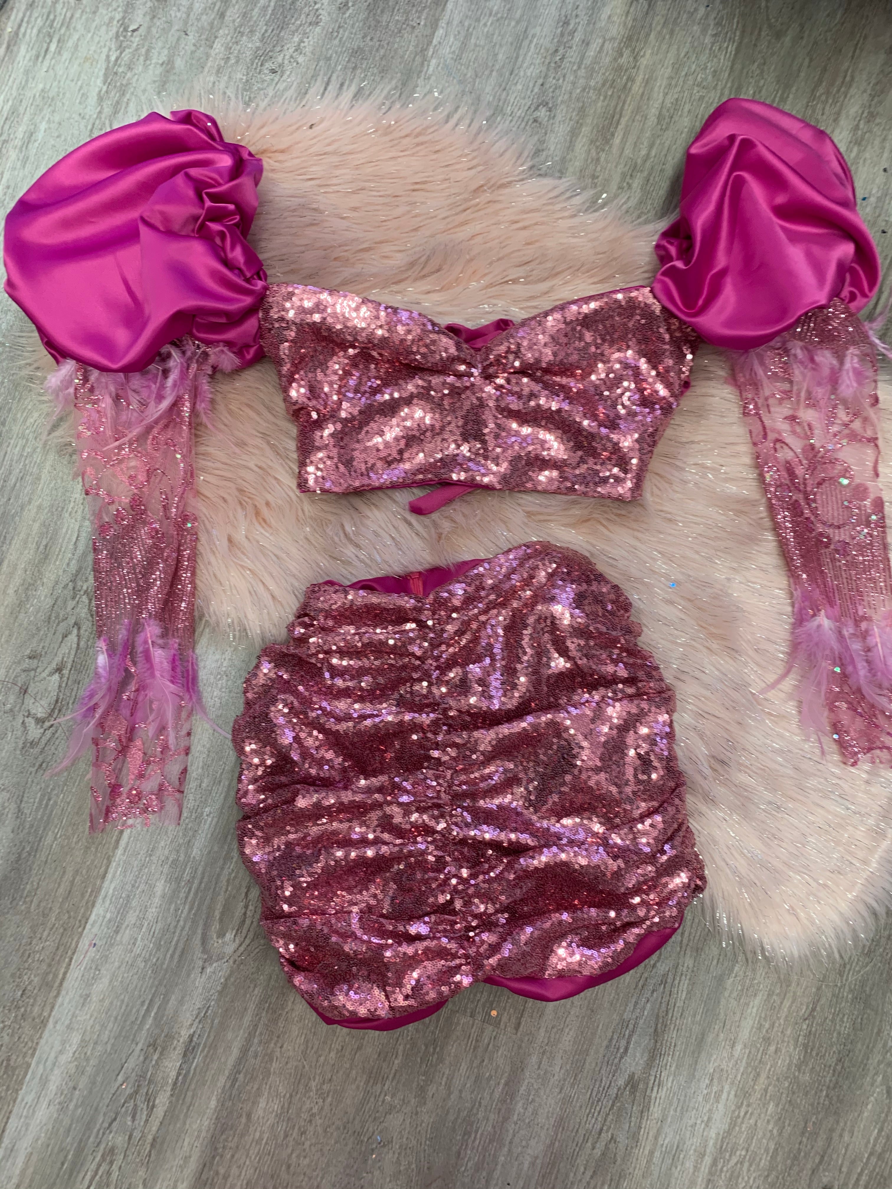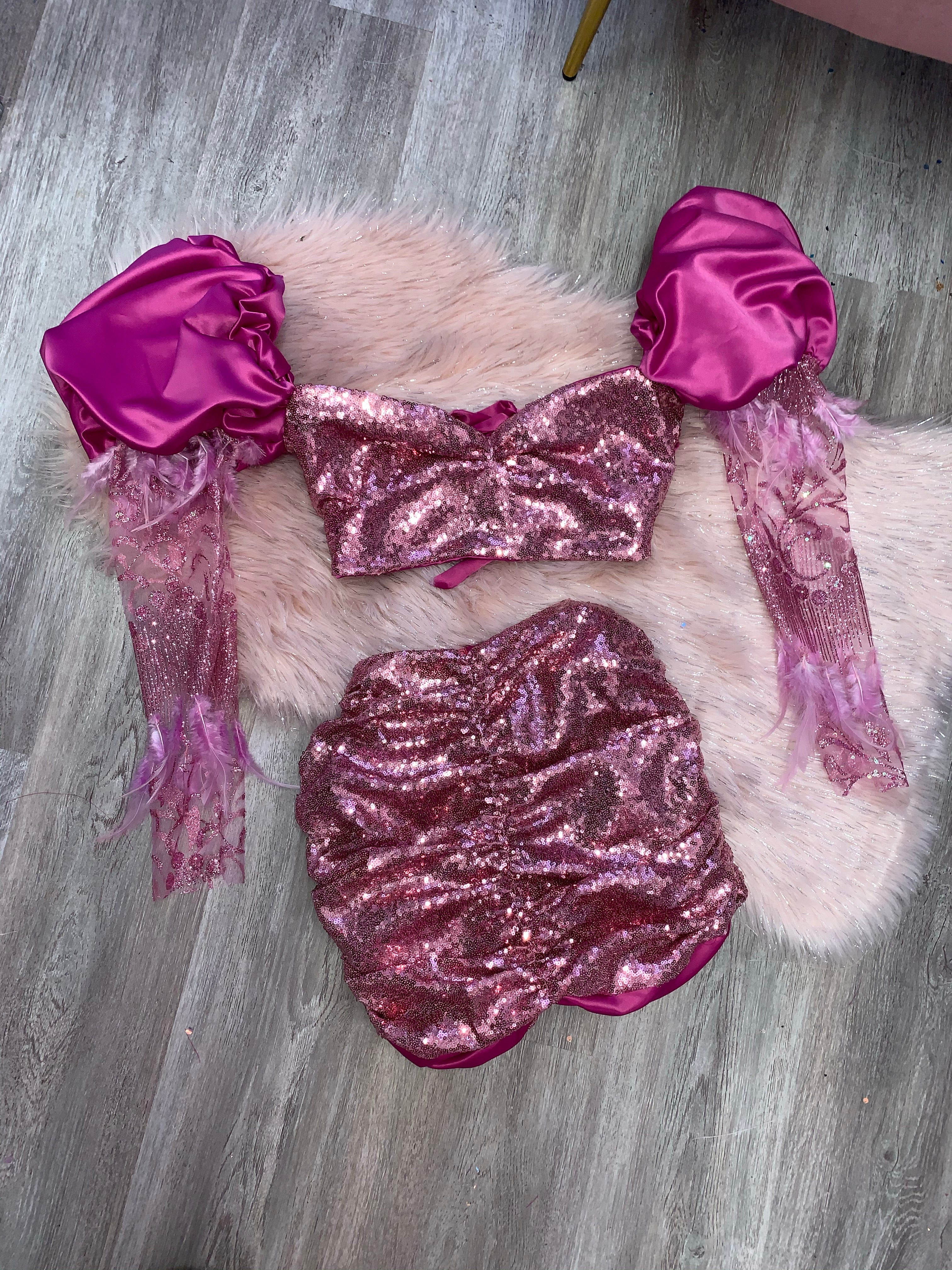 Size 8 Pink Sequin Feather Puffy Two Piece / Ready to ship