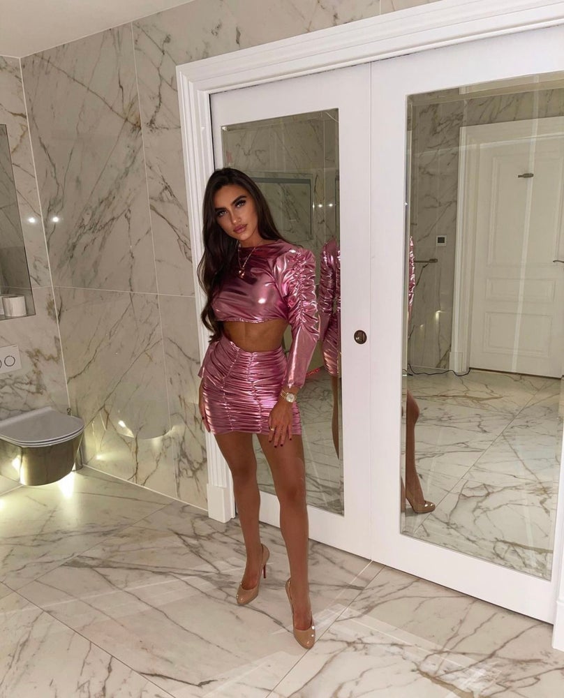 Metallic pink fabric in a high waisted ruched skirt and high neck top with ruched sleeves and padded shoulders.