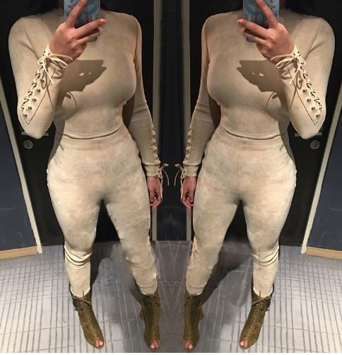Nude Faux Suede Two Piece Set. Stretchy fabric with cut out back on the top with concealed zip and lace up sleeves. Pants have lace up back and concealed zip. Size XS available.