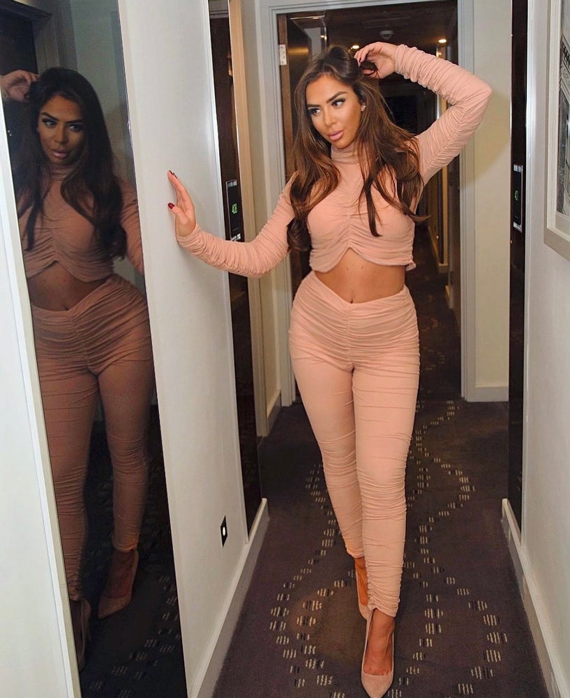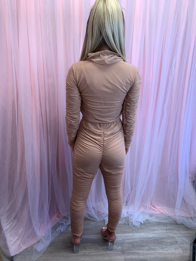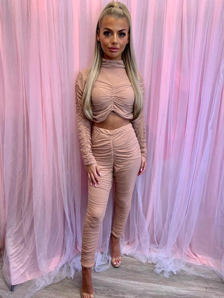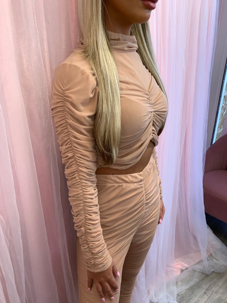 Nude Double Layer Soft Stretch Fabric. Ruched Leggings and Ruched bum. Ruched sleeves on the top and middle with shoulder pads.