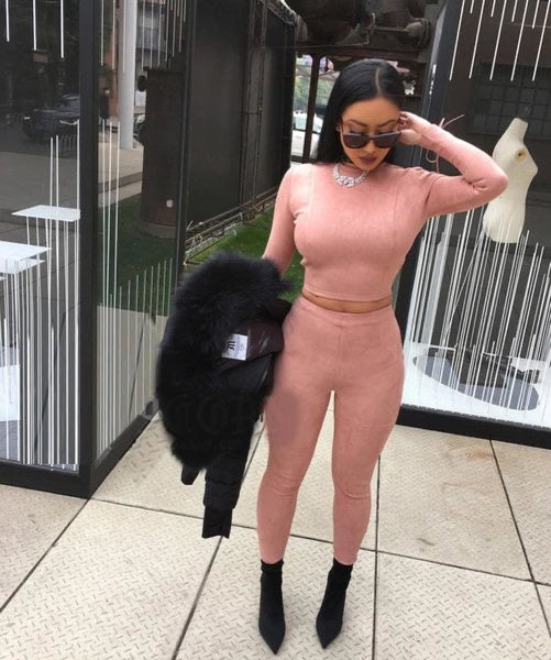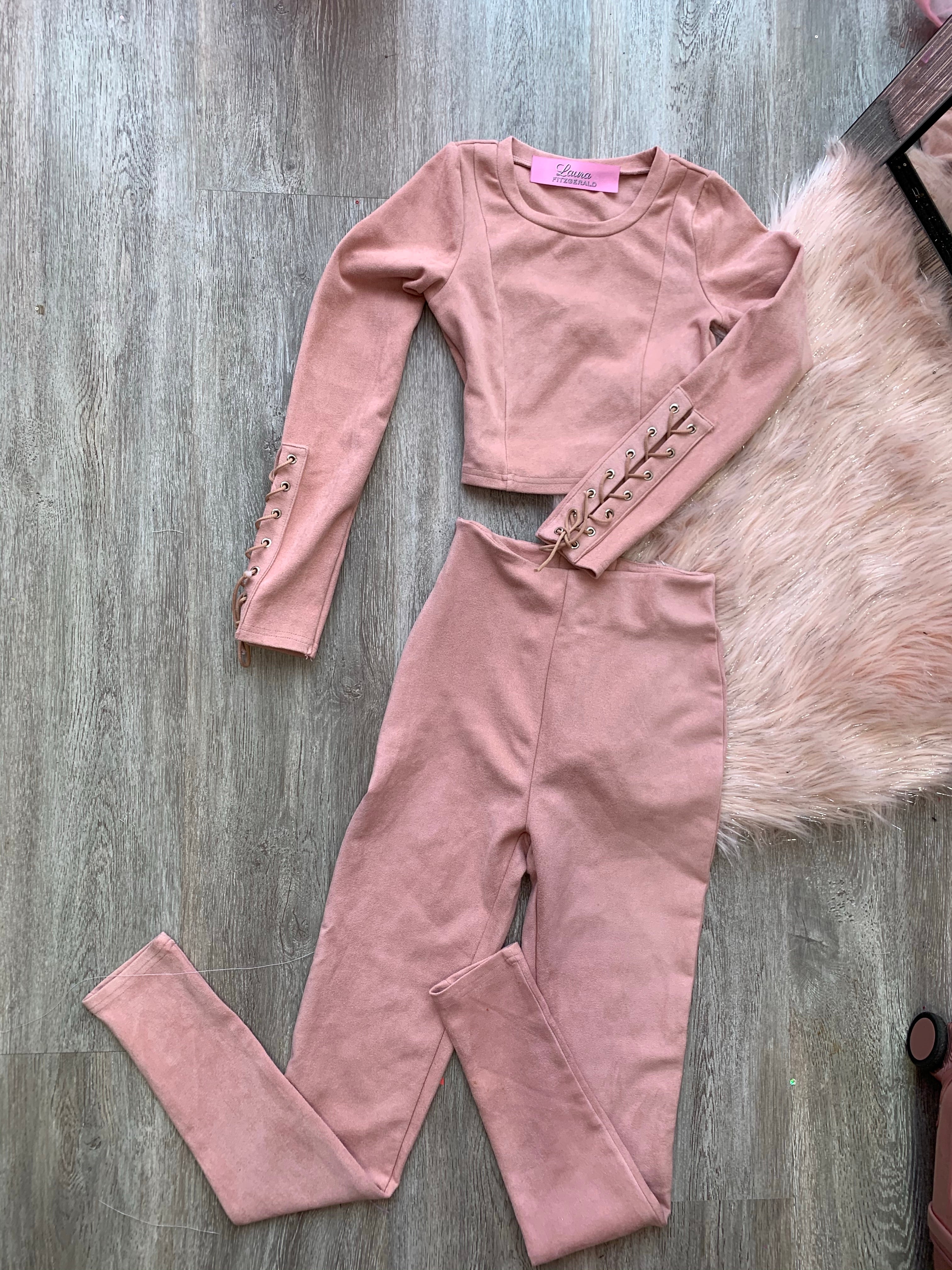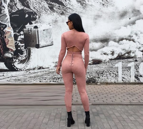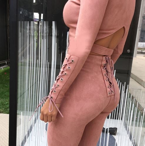 Pink Faux Suede Two Piece Set. Stretchy fabric with cut out back on the top with concealed zip and lace up sleeves. Pants have lace up back and concealed zip. Size XS available.