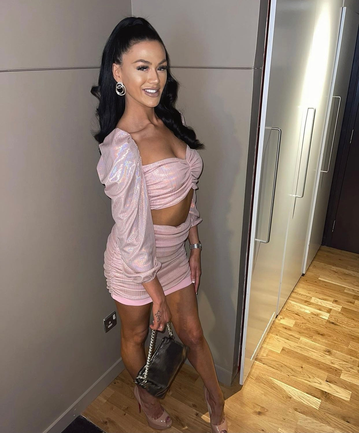 Pink metallic stretch two piece set. Skirt and top has ruched sides. Approx 2 weeks to be made.