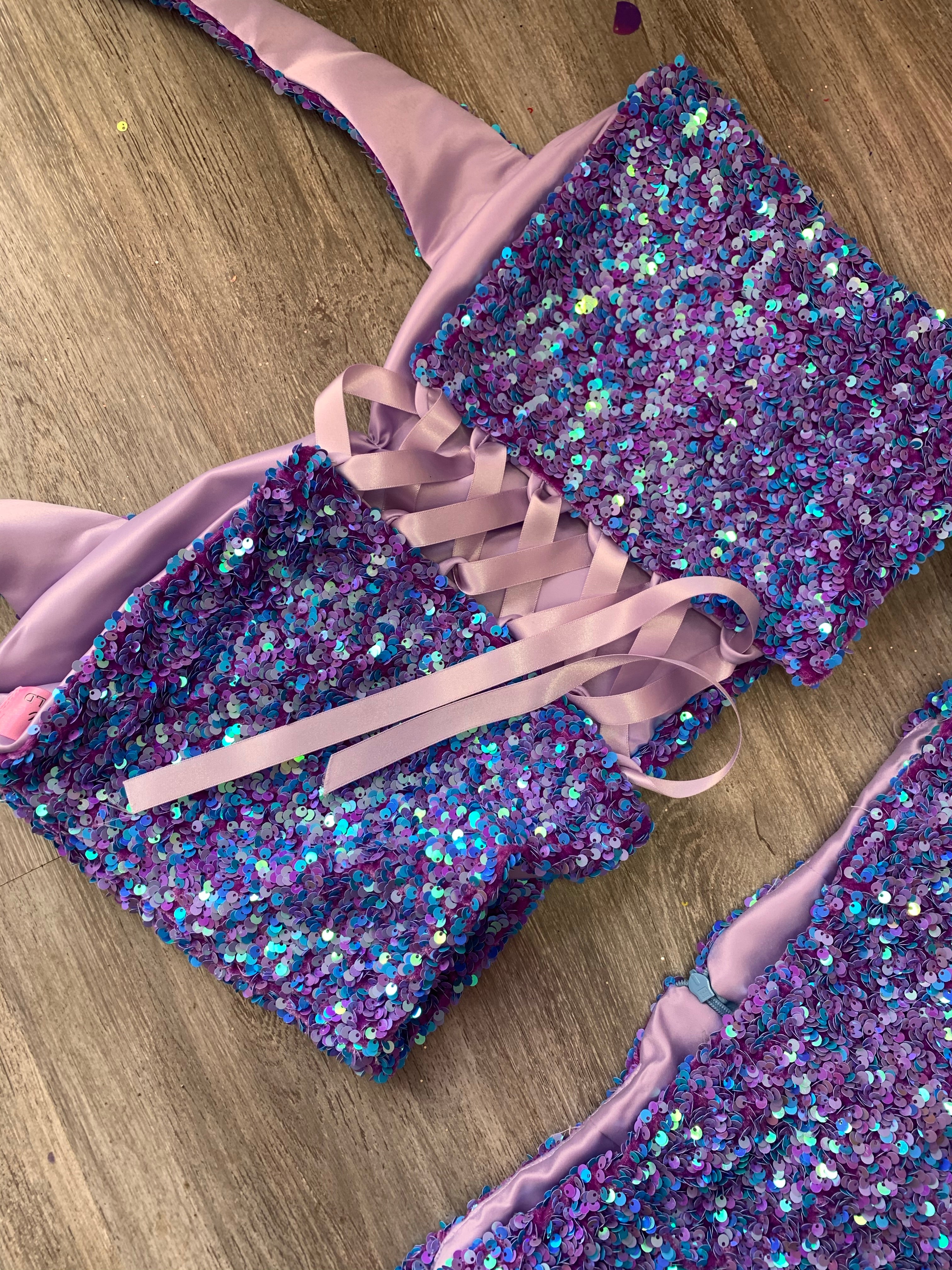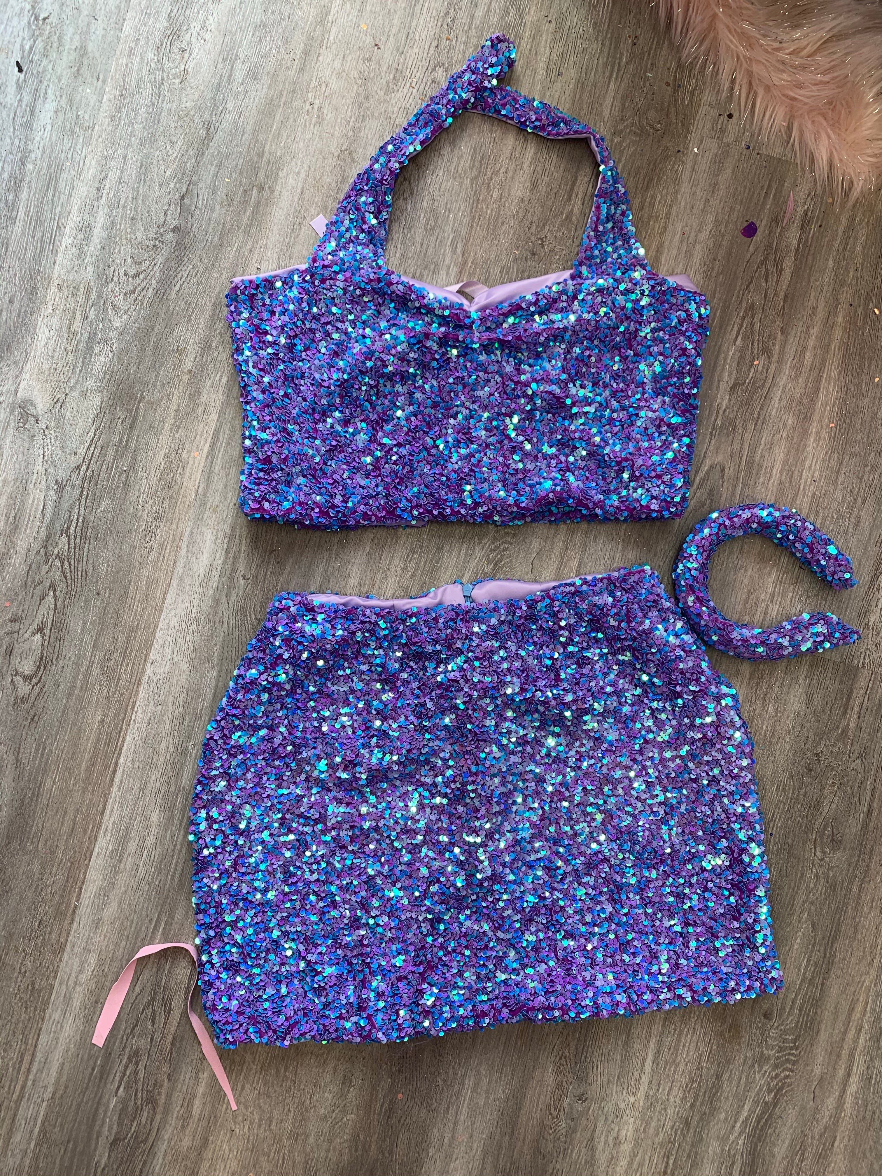 SIZE 14 sequin two piece set. High waisted skirt with concealed zip and top has a lace up back