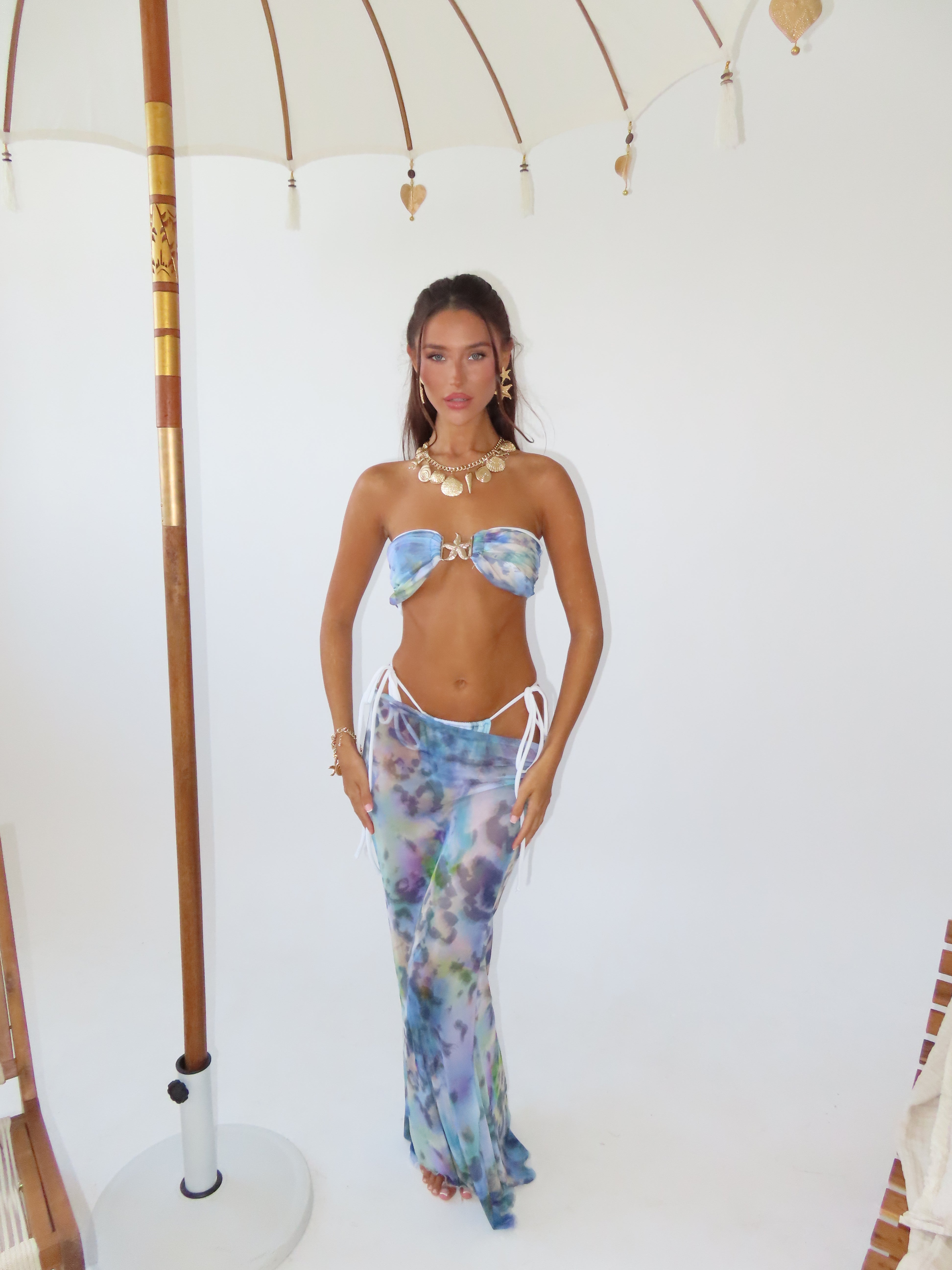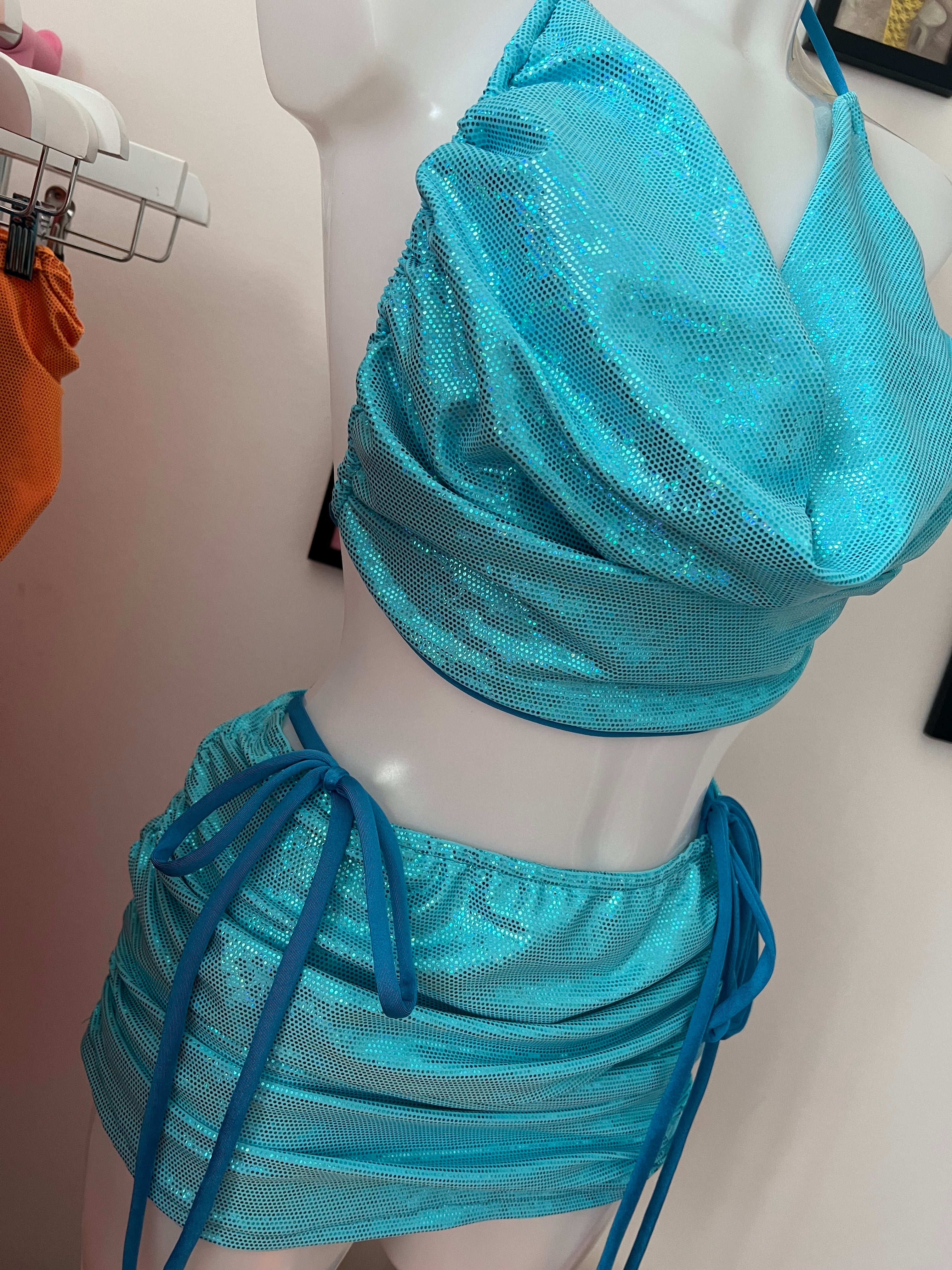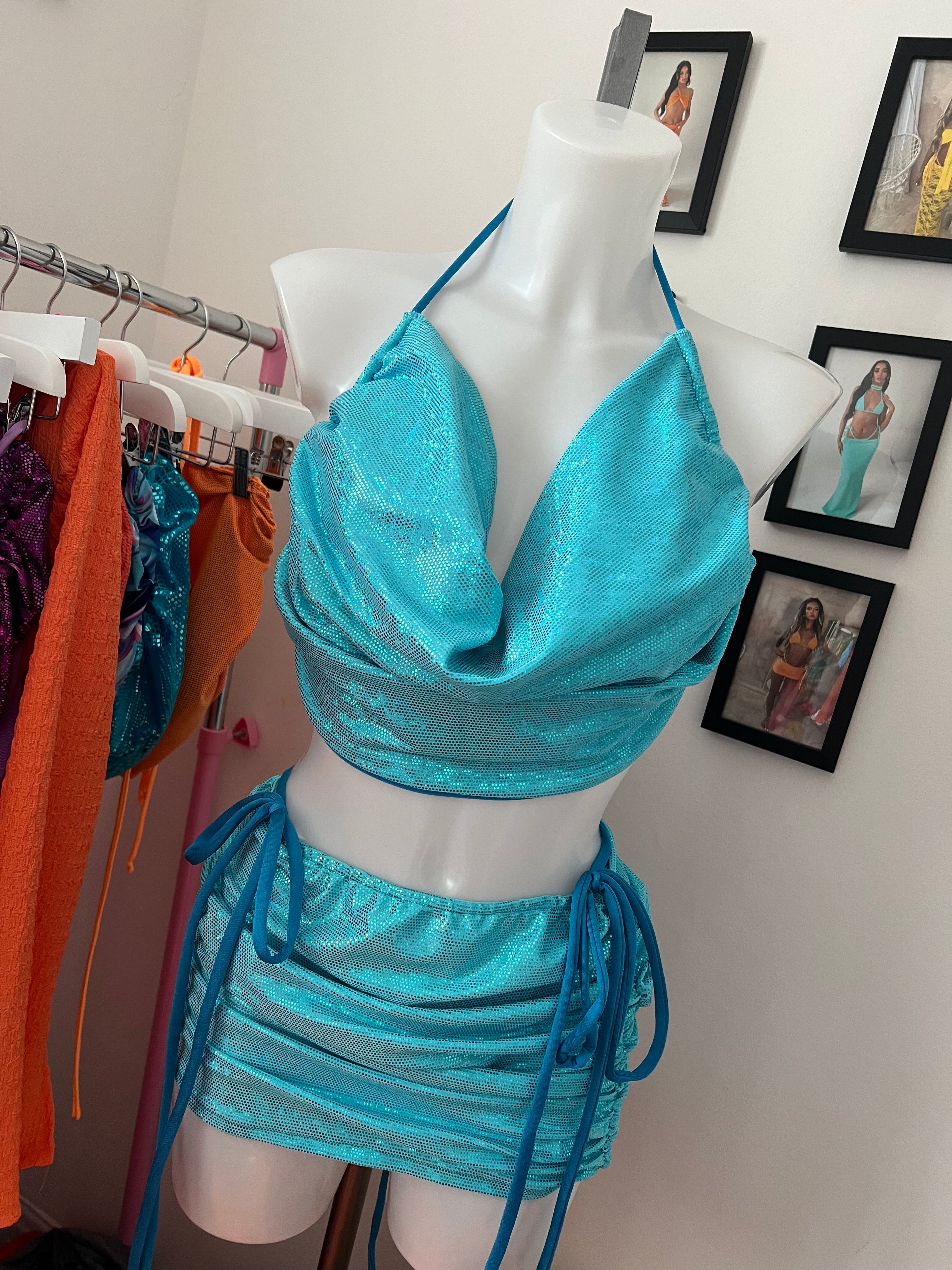 Blue Foil Cowl Neck Top with Bikini Bottoms & Ruched Skirt